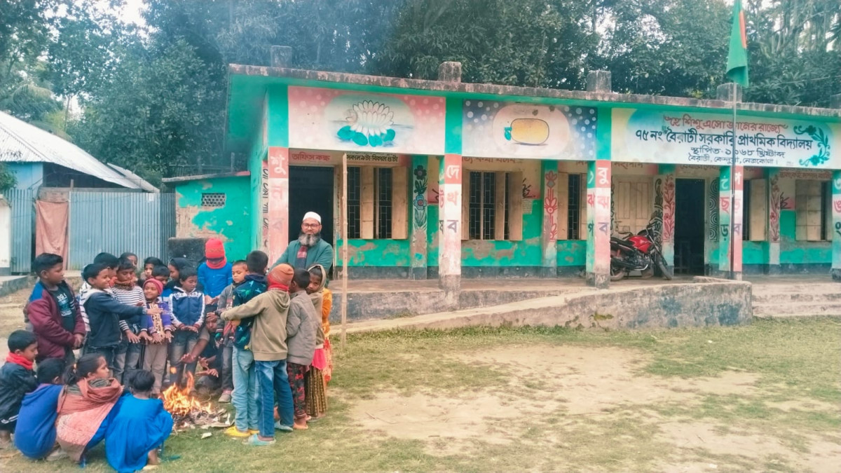 সোমবার (৫ জানুয়ারি) পৌনে ১২ টার দিকে ওই বিদ্যালয়ে সরেজমিনে গিয়ে দেখা যায়, বিদ্যালয়ের ভারপ্রাপ্ত প্রধান শিক্ষক শিশু শিক্ষার্থীদের নিয়ে আগুন পোহাচ্ছেন।