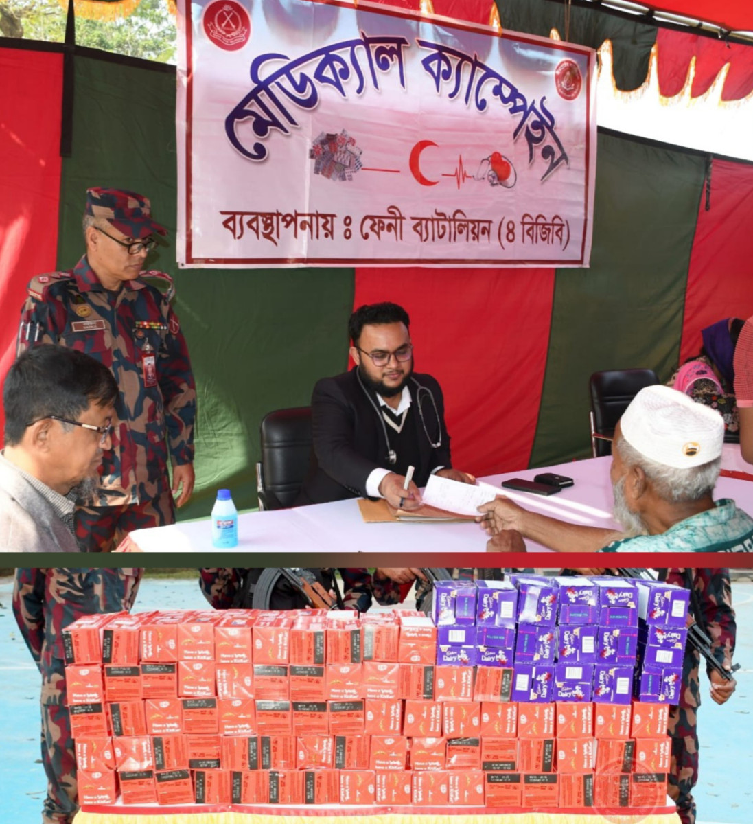 ফেনী সীমান্তে একই দিনে মানবিক সহায়তা ও কঠোর নজরদারির এক অনন্য দৃষ্টান্ত স্থাপন করেছে বর্ডার গার্ড বাংলাদেশ (বিজিবি)। বুধবার (১৪ জানুয়ারি ২০২৬) দিনব্যাপী পৃথক অভিযানে ফেনী ব্যাটালিয়ন (৪ বিজিবি) একদিকে যেমন অসহায় মানুষের দ্বারে পৌঁছে দিয়েছে চিকিৎসা সেবা ও শীতবস্ত্র, অন্যদিকে কঠোর হাতে দমন করেছে সীমান্ত অপরাধ। এদিন চোরাচালান বিরোধী অভিযানে বিপুল পরিমাণ মাদক ও ভারতীয় পণ্য জব্দ করা হয়।