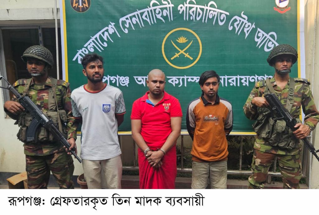 নারায়ণগঞ্জের রূপগঞ্জ উপজেলার ভুলতা ইউনিয়নের লাভরাপাড়া এলাকায় যৌথ বাহিনী অভিযান চালিয়ে বিপুল পরিমাণ মাদকদ্রব্যসহ তিন যুবককে গ্রেফতার করেছে।