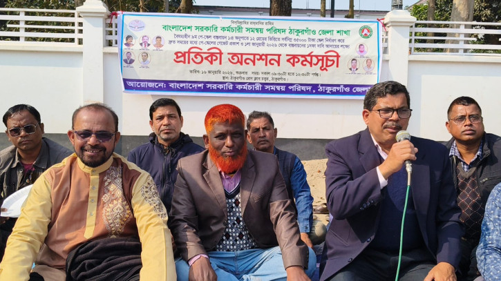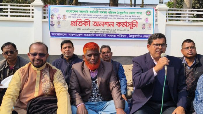বাংলাদেশ সরকারি কর্মচারী সমন্বয় পরিষদ ঠাকুরগাঁও জেলা শাখার আয়োজনে বৈষম্যহীন নবম পে স্কেল বাস্তবায়ন, ১ : ৪ অনুপাতে ১২ গ্রেডের ভিত্তিতে সর্বনিম্ন ৩৫ হাজার টাকা নির্ধারণ করে দ্রুত সময়ের মধ্যে পে স্কেলের গেজেট প্রকাশ ও ১ জানুয়ারি ২০২৬ থেকে বাস্তবায়নের এক দফা দাবি আদায় লক্ষ্যে ঠাকুরগাঁওয়ে প্রতীকী অনশন পালন করা হয়েছে।
