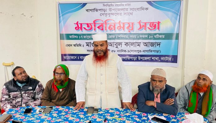 ১৭ জানুয়ারি রোজ শনিবার দুপুরে নাটোরের বাগাতিপাড়ায় বাংলাদেশ জামায়াতে ইসলামীর কার্যালয়ে উপজেলার কর্মরত সাংবাদিকদের সাথে মতবিনিময়ের সময় প্রধান অতিথি হিসেবে উপস্থিত থেকে এমনই বক্তব্য রাখেন তিনি।