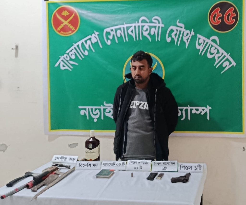 নড়াইলের লোহাগড়া উপজেলায় বিদেশি পিস্তল ও গুলিসহ ইতনা গ্রামের পশ্চিমপাড়ার শিকদার আনোয়ার হোসেনের ছেলে শিকদার লিমন (৩৫) নামে যুবককে গ্রেফতার করেছে যৌথবাহিনী।