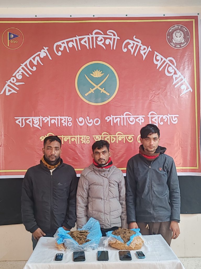 পরবর্তীতে সেনাবাহিনী ইয়াকুব আলীর বাড়িতে তল্লাশি চালিয়ে তার দুই সহযোগী লিটন মিয়া (৩৩) ও জালাল মিয়া (৩০)-কে হাতেনাতে আটক করে। এ সময় তাদের কাছ থেকে মোট ২ কেজি গাঁজা এবং ৫টি মোবাইল ফোন উদ্ধার করা হয়, যার মধ্যে ৩টি স্মার্টফোন রয়েছে।