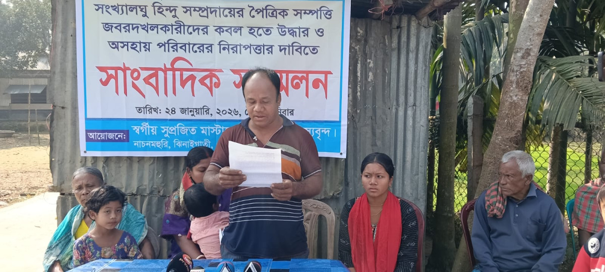 শেরপুরের ঝিনাইগাতী উপজেলার কাংশা ইউনিয়নের নাচনমুহুরী গ্রামে সংখ্যালঘু এক হিন্দু পরিবারের পৈত্রিক সম্পত্তি জবরদখল ও নিরাপত্তাহীনতার অভিযোগে সাংবাদিক সম্মেলন অনুষ্ঠিত হয়েছে। শনিবার (২৪জানুয়ারি) দুপুরে ভুক্তভোগীর নিজ বাড়িতে এ সংবাদ সম্মেলনের আয়োজন করা হয়।