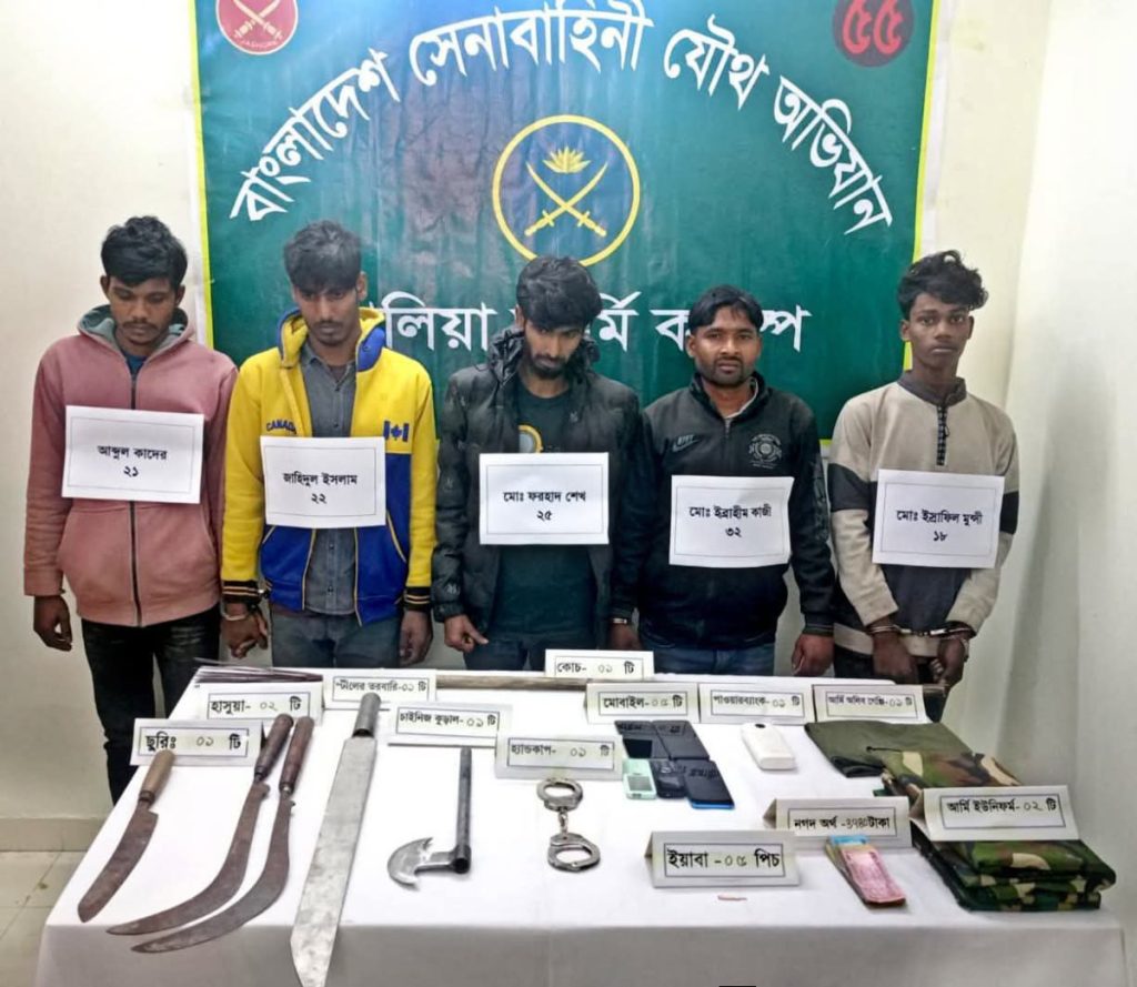 গ্রেপ্তার ব্যক্তিরা হলেন,দেবদুন গ্রামের মো. ইব্রাহিম কাজী (৩২),পিতা ইলিয়াস কাজী, ফরহাদ শেখ (২৫),পিতা শেখ সৈয়দ আলী,ইসরাফিল মুন্সি (১৬),পিতা ইব্রাহিম মুন্সি,জাহিদুল ইসলাম (২২), পিতা (মৃত) সারোয়ার এবং আব্দুল কাদের (২১),পিতা (মৃত) তাহাদ্দুদ। তাঁরা সবাই নড়াগাতি থানাধীন জয়ানগর ইউনিয়নের বাসিন্দা।