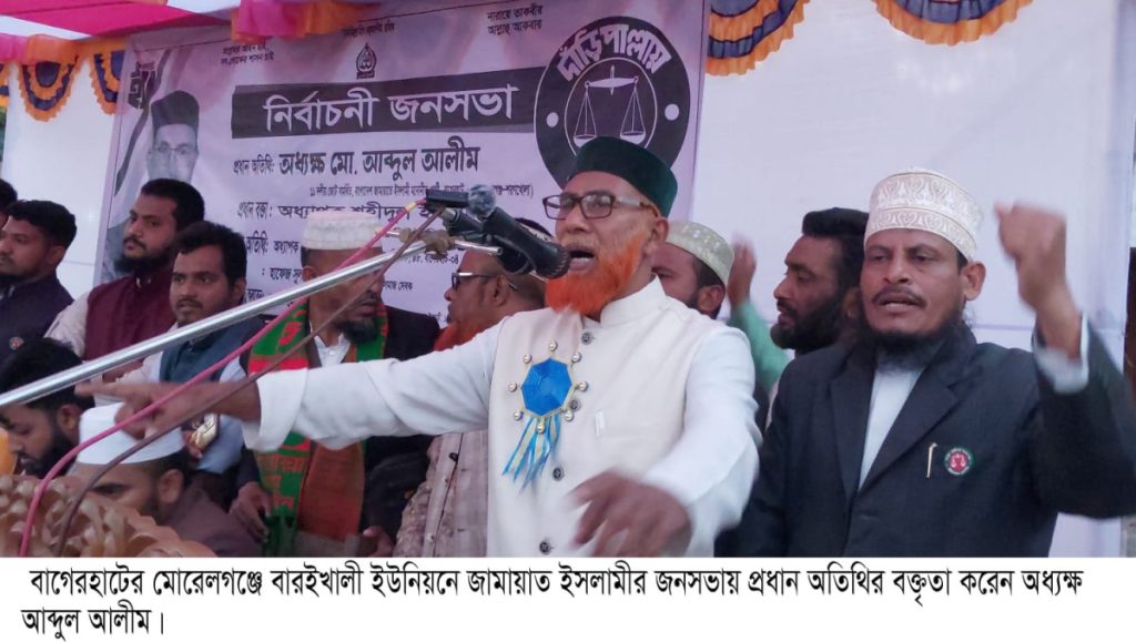 বৃহস্পতিবার বিকেলে উপজেলার বারইখালী ইউনিয়নে সুতালড়ী মাধ্যমিক বিদ্যালয় মাঠে আয়োজিত নির্বাচনী জনসভায় প্রধান অতিথির বক্তৃতা করেন অধ্যক্ষ আব্দুল আলীম। প্রধান বক্তা ছিলেন জামায়াত নেতা অধ্যাপক শহিদুল ইসলাম। বারইখালী ইউনিয়ন জামায়াত ইসলামীর সভাপতি মোহিবুল্লাহ রফিকের সভাপতিত্বে বিশেষ অতিথির বক্তৃতা করেন উপজেলা জামায়াত ইসলামীর আমির অধ্যাপক শাহাদৎ হোসাইন, হাফেজ সুলতান আহমদসহ বিভিন্ন নেতৃবৃন্দ। একই দিন সন্ধ্যায় মোরেলগঞ্জ সদর ইউনিয়নের বিশারীঘাটা বিবি আফসার আলী মাধ্যমিক মাঠে আয়োজিত জামায়াত ইসলামীর নির্বাচনী জনসভায় প্রধান অতিথির বক্তৃতা করেন অধ্যক্ষ আব্দুল আলীম। সদর ইউনিয়নের জামায়াত ইসলামীর সভাপতি অধ্যক্ষ মাওলানা আব্দুল আলীমের সভাপতিত্বে বিশেষ অতিথির বক্তৃতা করেন উপজেলা জামায়াতে ইসলামীর আমির অধ্যক্ষ শাহাদৎ হোসাইন, হাফেজ সুলতান আহমদ, জামায়াত নেতা হাবিবুল্লাহ তালুকদার, ইউনিয়ন জামায়াত ইসলামীর যুব বিভাগের সভাপতি নাইম আহমেদ। অনুষ্ঠান সঞ্চালনা করেন ইউনিয়ন জামায়াত ইসলামীর সেক্রেটারী হাফেজ মো. শফিকুল ইসলাম।
