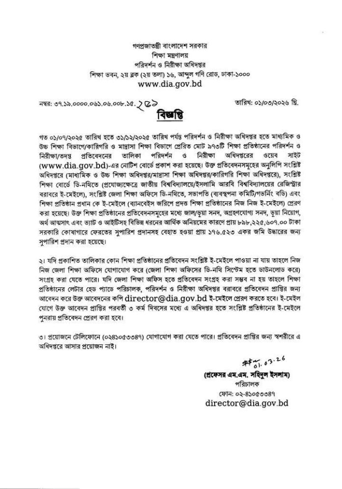 পরিদর্শন ও নিরীক্ষা অধিদপ্তরের তথ্যমতে, গত ১ জুলাই ২০২৫ থেকে ৩১ ডিসেম্বর ২০২৫ পর্যন্ত সময়ে সারাদেশে মোট ১৯৭টি শিক্ষা প্রতিষ্ঠানে অডিট কার্যক্রম পরিচালনা করা হয়েছে। এই অডিট রিপোর্টে যে ভয়াবহ অনিয়মের তালিকা উঠে এসেছে, তা যে কাউকে বিস্মিত করবে। প্রতিবেদনে দেখা গেছে, জাল বা ভুয়া সনদ ব্যবহার করে শিক্ষকতা, ভুয়া নিয়োগের মাধ্যমে এমপিও সুবিধা গ্রহণ, সরাসরি অর্থ আত্মসাৎ এবং ভ্যাট ও আইটি সংক্রান্ত ব্যাপক আর্থিক অনিয়ম হয়েছে।