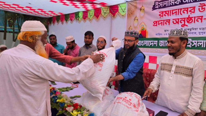 ফেনী জেলার দাগনভূঞা থানাধীন জায়লস্কর ইউনিয়নের ৫ ও ৬ নম্বর ওয়ার্ডের ৪০০ পরিবারের মাঝে পবিত্র রমজান মাস উপলক্ষে বিশেষ উপহার সামগ্রী বিতরণ করেছে বাংলাদেশ জামায়াতে ইসলামী। শনিবার, ০৭ মার্চ ২০২৬ সালের দুপুর ২টা ৩০ মিনিটে বারাহিগুনী মাকছুদিয়া মাদ্রাসা মাঠে স্থানীয় শাখার উদ্যোগে এই মানবিক কার্যক্রম এবং একটি প্রাসঙ্গিক ইসলামিক আলোচনা সভার আয়োজন করা হয়।