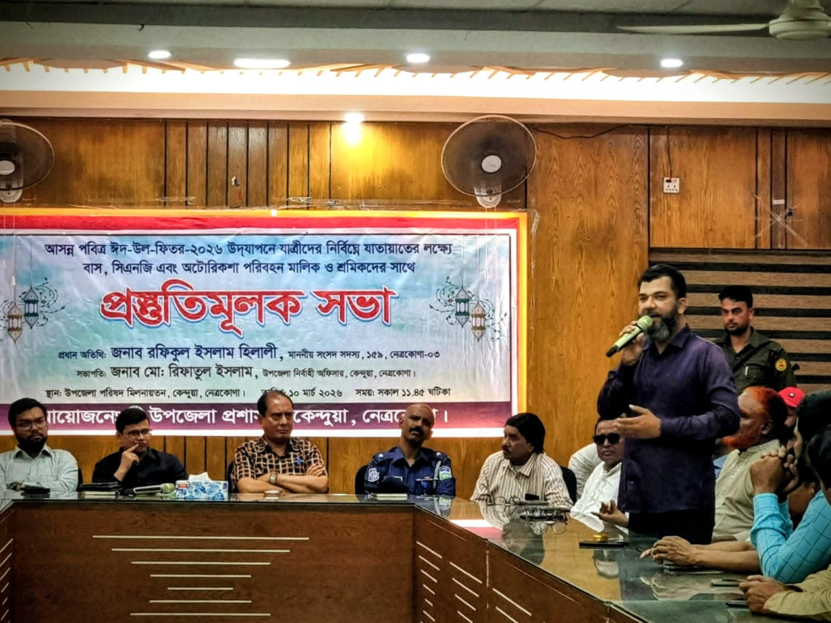 আসন্ন ঈদুল ফিতর-২০২৬ ইং উদযাপন উপলক্ষ্যে যাত্রীদের নির্বিঘ্নে যাতায়াতের লক্ষ্যে বাস, সিএনজি এবং অটোরিকশা পরিবহন মালিক ও শ্রমিকদের সাথে নেত্রকোণার কেন্দুয়া উপজেলা প্রশাসনের আয়োজনে উপজেলা পরিষদ হল রুমে মঙ্গলবার (১০ মার্চ) সকাল পৌঁনে ১২ টার দিকে এক মতবিনিময় সভা অনুষ্ঠিত হয়েছে।