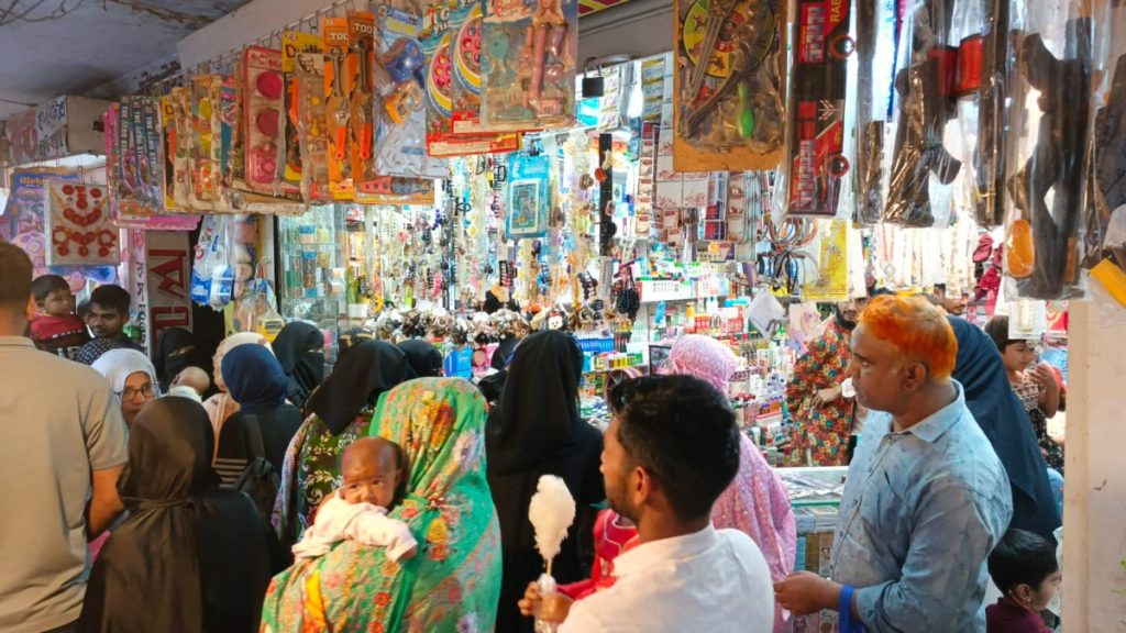 পোশাকের দোকানগুলোতে ঈদ উপলক্ষে পুরুষদের পায়জামা-পাঞ্জাবি, শার্ট-প্যান্ট, গেঞ্জি, টিশার্ট, নারীদের জন্য বাহারি ডিজাইনের শাড়ি, থ্রি পিস, ওয়ান পিস, কুর্তা এবং বাচ্চা ও শিশুদের পায়জামা-পাঞ্জাবি, ফ্রকসহ আধুনিক ডিজাইনের পোশাক বিক্রি হচ্ছে। একইসঙ্গে কসমেটিকস, জুতা, ঘর সাজানোর সামগ্রী এবং গহনার দোকানগুলোতেও ভিড় করছেন মানুষজন।