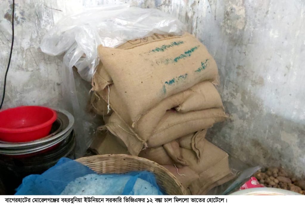 বাগেরহাটের মোরেলগঞ্জে বহরবুনিয়া ইউনিয়নে ঈদ উপলক্ষে অসহায় দু:স্থদের মাঝে বিতরণকৃত ভিজিএফএর ১২ বস্তা চাল মিললো ফুলহাতা বাজারের রেন্টুর ভাতের হোটেলে।