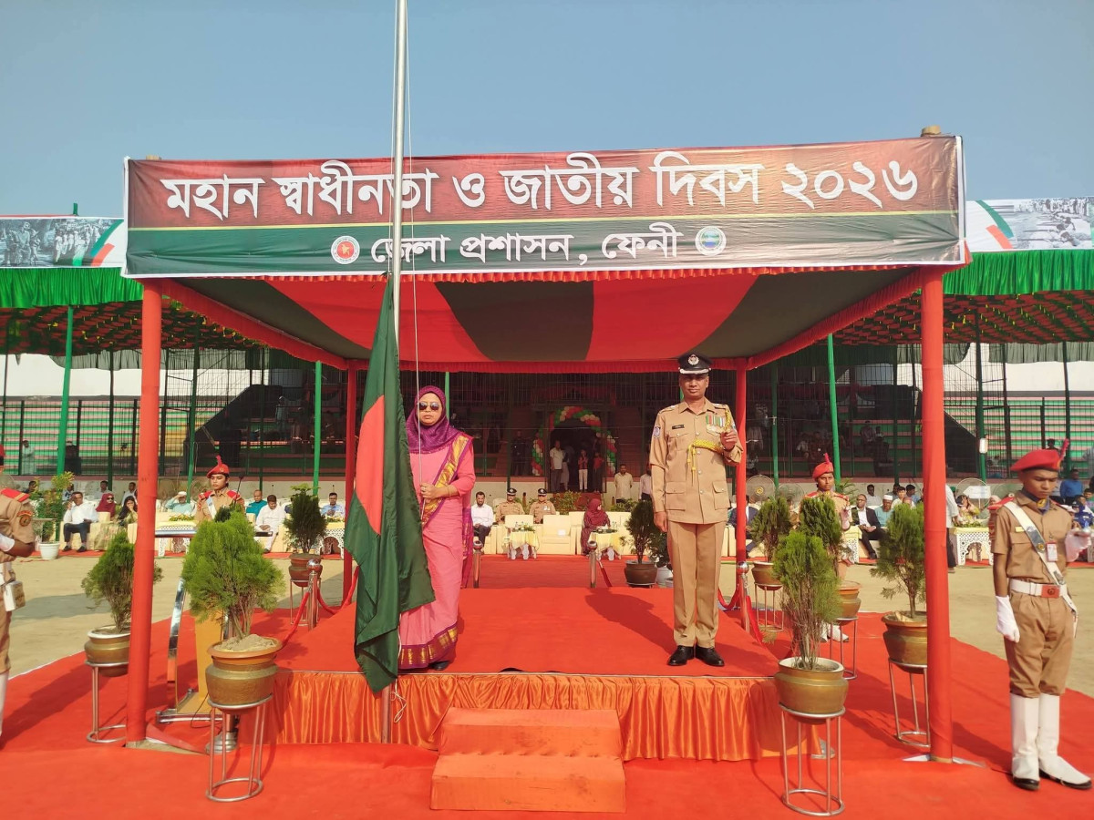 বিনম্র শ্রদ্ধা, তোপধ্বনি ও বর্ণাঢ্য কুচকাওয়াজের মধ্য দিয়ে ফেনী জেলায় বৃহস্পতিবার ২৬ মার্চ, ২০২৬ তারিখে মহান স্বাধীনতা ও জাতীয় দিবস পালিত হয়েছে। সূর্যোদয়ের সাথে সাথে শহরের মুক্তিযুদ্ধ স্মৃতিস্তম্ভে একত্রিশবার তোপধ্বনির মাধ্যমে দিনটির আনুষ্ঠানিক সূচনা হয়। এরপর সেখানে পুষ্পস্তবক অর্পণ করে একাত্তরের বীর শহীদদের প্রতি গভীর শ্রদ্ধা নিবেদন করেন ফেনীর জেলা প্রশাসক মনিরা হক এবং জেলা পুলিশ সুপার। জেলার দাগনভূঞা উপজেলা প্রশাসন ও থানা পুলিশের পক্ষ থেকেও স্থানীয় পর্যায়ে অনুরূপ কর্মসূচি পালন করা হয়।