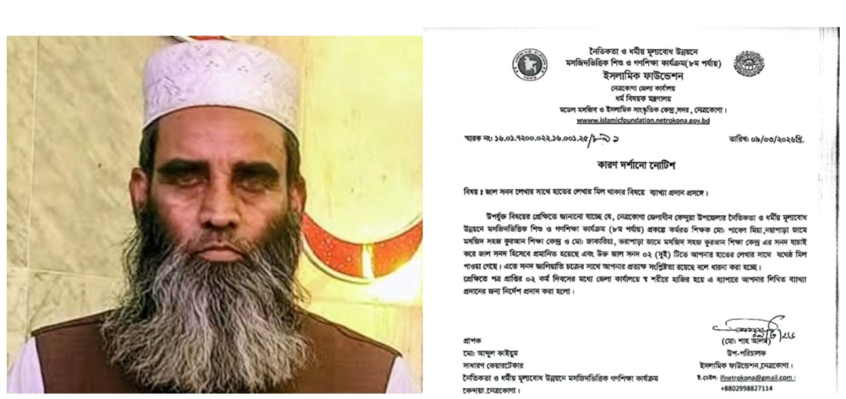 নেত্রকোণার কেন্দুয়া উপজেলায় ইসলামিক ফাউন্ডেশনের মসজিদভিত্তিক শিশু ও গণশিক্ষা কার্যক্রমে জাল সনদ কেলেঙ্কারির অভিযোগে এক কেয়ারটেকারকে কারণ দর্শানোর নোটিশ দেওয়া হয়েছে। বিষয়টি স্থানীয়ভাবে ব্যাপক আলোচনার সৃষ্টি করেছে।
