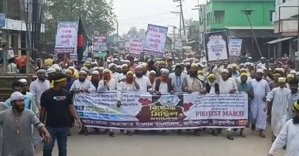 ঠাকুরগাঁওয়ে হযরত মুহাম্মদ (সা.)-কে নিয়ে সামাজিক যোগাযোগ মাধ্যমে কটূক্তি ও অবমাননাকর মন্তব্য করার প্রতিবাদে উত্তাল হয়ে উঠেছে জনপদ। অভিযুক্ত বিধান রায়ের দৃষ্টান্তমূলক শাস্তির দাবিতে আজ এক বিশাল বিক্ষোভ মিছিল ও প্রতিবাদ সমাবেশ অনুষ্ঠিত হয়েছে।