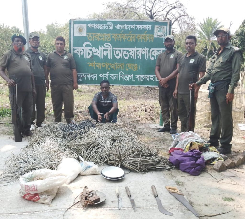 সুন্দরবন বিভাগ জানায়, সুন্দরবন পূর্ব বিভাগের শরণখোলা রেঞ্জের কচিখালী অভয়ারণ্য কেন্দ্রের ভারপ্রাপ্ত কর্মকর্তা ফরেষ্টার মিজানুর রহমানের নেতৃত্বে বনরক্ষীরা শনিবার (৪ এপ্রিল) সকালে সুন্দরবনের কচিখালীর ডিমেরচরে নিয়মিত টহলকালে বনের মধ্যে মালাফাঁদ পাতা দেখতে পান। এ সময় বনরক্ষীরা তল্লাশী করে ছগির খান নামে এক হরিণ শিকারীকে হাতেনাতে আটক করতে সক্ষম হয়। আটক শিকারীর কাছ থেকে ৪ হাজার ফুট মালাফাঁদ, মাংস পরিমাপ করা দাড়িপাল্লা, ২ কেজি সাদা পলিথিন, প্লাষ্টিক বস্তা,চাল ডালসহ আনুষঙ্গিক মালামাল জব্দ করে বনরক্ষীরা। এসময়ে বনরক্ষীদের উপস্থিতি টের পেয়ে আরো ৫ হারিণ শিকারী পালিয়ে যায়।