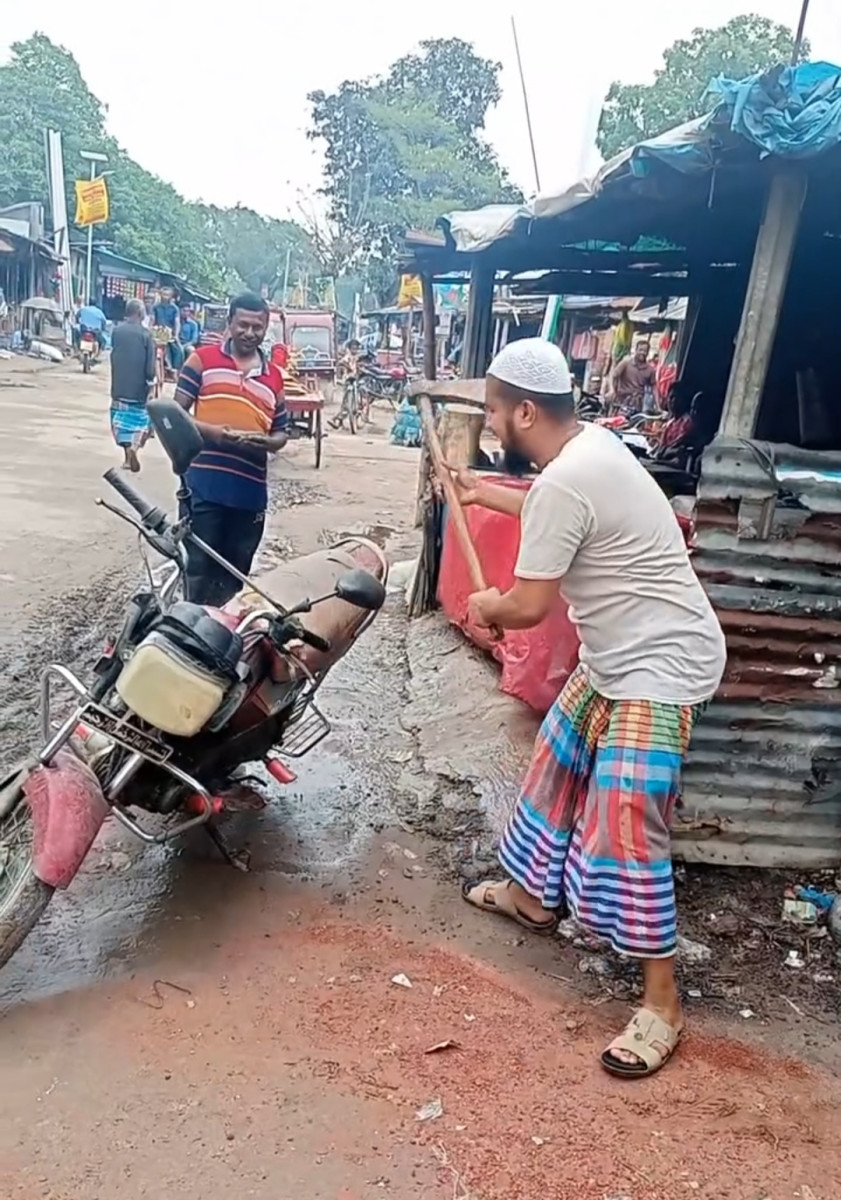 বাজারে উপস্থিত লোকজন জানান, সকালে জসীম তার মোটরসাইকেলটি নিয়ে দোকানের সামনে আসেন। এসময় তেলের জন্য তার ক্ষোভ প্রকাশ করতে দেখা যায়। হঠাৎ তিনি খড়ি কাটা কুড়াল দিয়ে নিজের প্রিয় যানটির ওপর আঘাত করতে থাকেন। মুহূর্তের মধ্যেই মোটরসাইকেলটির বেশ কিছু অংশ ক্ষতিগ্রস্ত হয়।