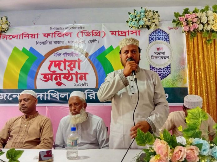 ফেনীর দাগনভূঞা উপজেলার সিলোনীয়া ফাজিল ডিগ্রি মাদরাসায় ২০২৬ সালের আসন্ন দাখিল পরীক্ষার্থীদের সাফল্য কামনায় বিশেষ দোয়া ও আলোচনা সভা অনুষ্ঠিত হয়েছে। রোববার (১৯ এপ্রিল) মাদরাসা প্রাঙ্গণে আয়োজিত এই অনুষ্ঠানে শিক্ষার্থীদের উদ্দেশ্যে দিকনির্দেশনামূলক বক্তব্য রাখেন পরিচালনা পর্ষদের সদস্য ও স্থানীয় বিশিষ্টজনেরা।